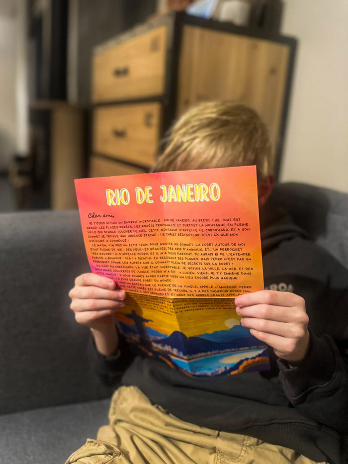 Chaque mois, votre enfant reçoit du courrier signé Lucien, un explorateur (imaginaire - mais chut, ça reste entre nous !) qui parcourt le monde. Une lettre manuscrite et illustrée, pleine d’histoires, de découvertes et de petits défis, pour explorer un nouveau pays chaque mois. On y découvre les cultures, traditions, langues, plats typiques… et plein d’autres curiosités du monde entier ! Pensée pour les 6-12 ans, cette aventure donne envie de lire tout en développant sa curiosité et sa culture générale. Un rendez-vous que les enfants attendent avec impatience, et qui fait revivre la magie de la correspondance postale.
